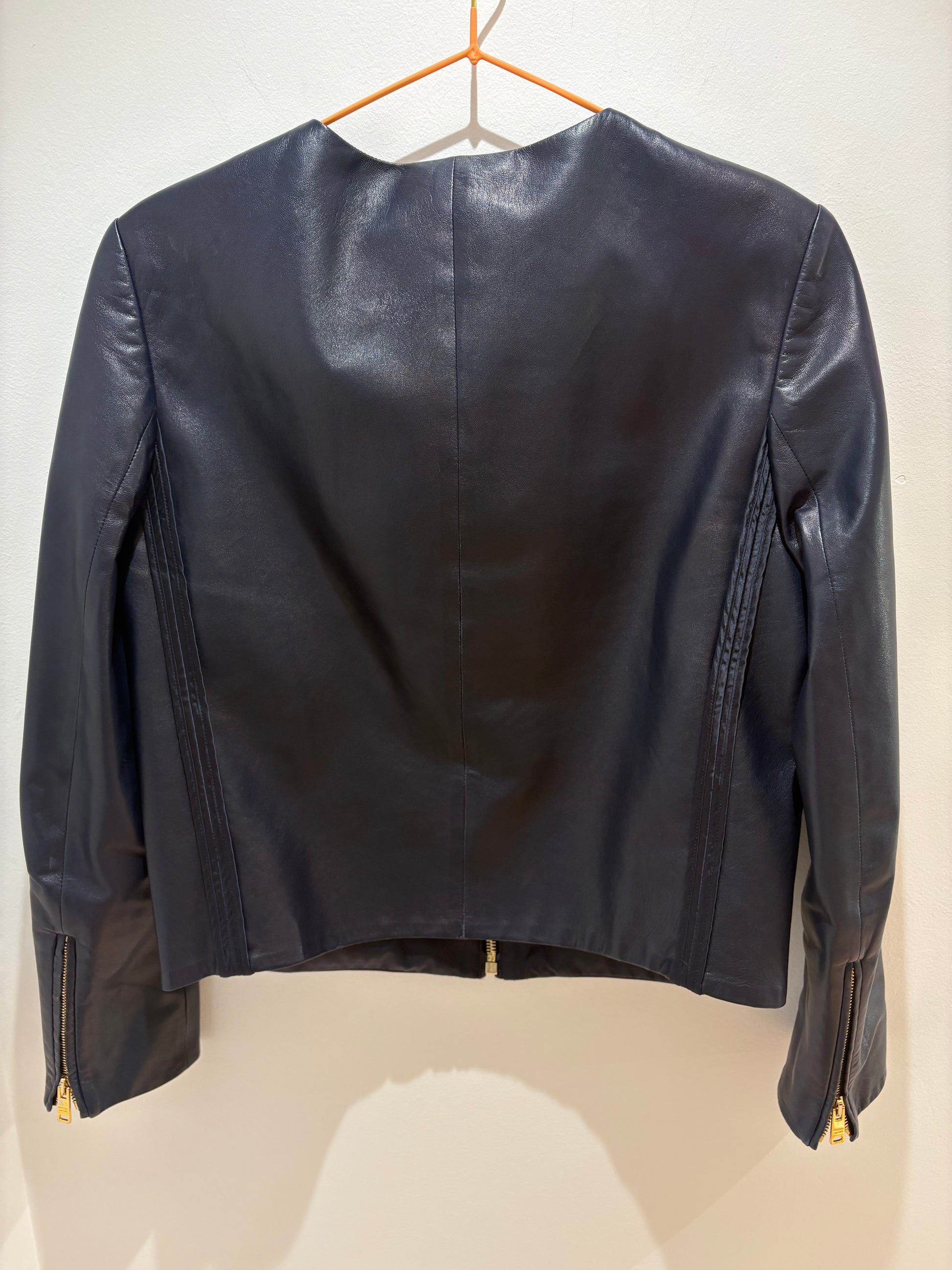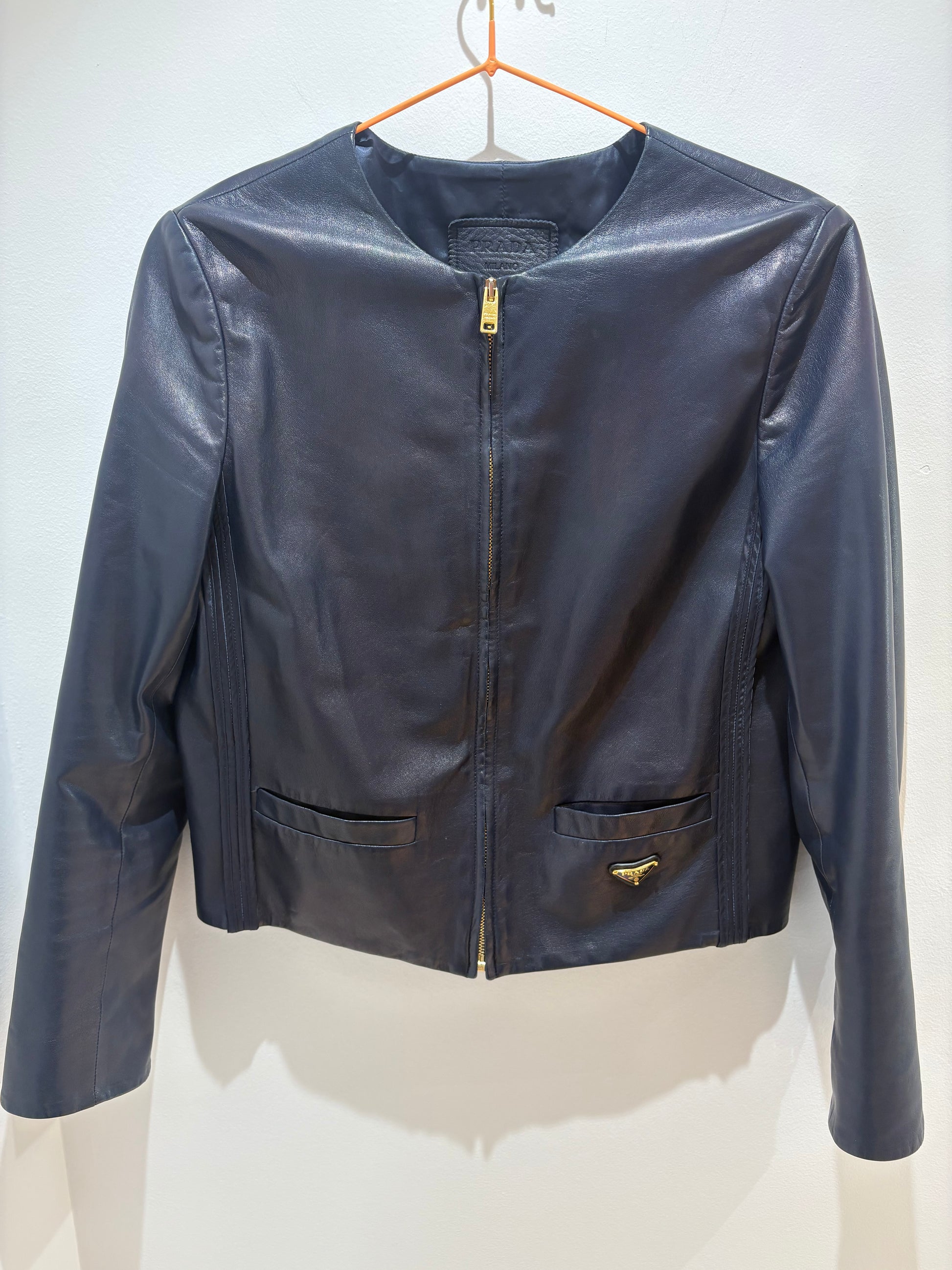 Sublime veste Prada en cuir d’agneau bleu nuit, coupe minimaliste et élégante typique de la maison.