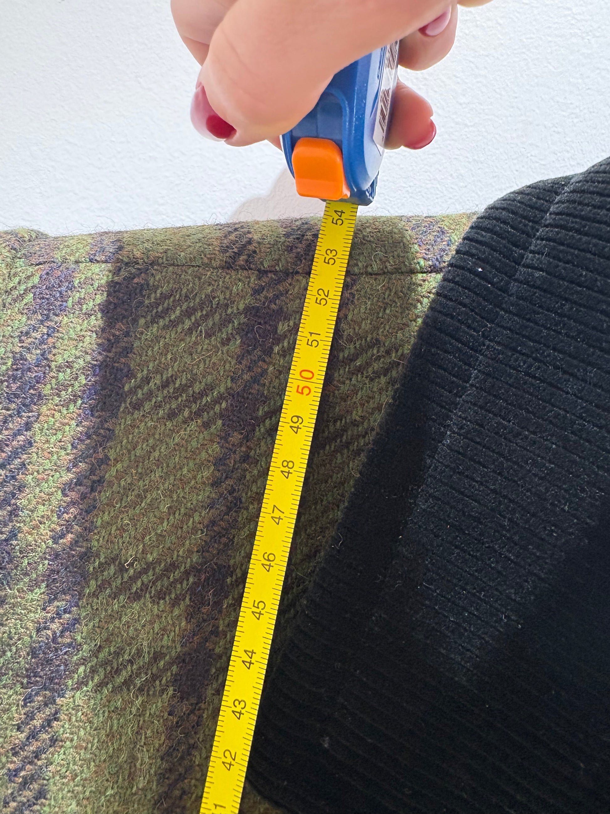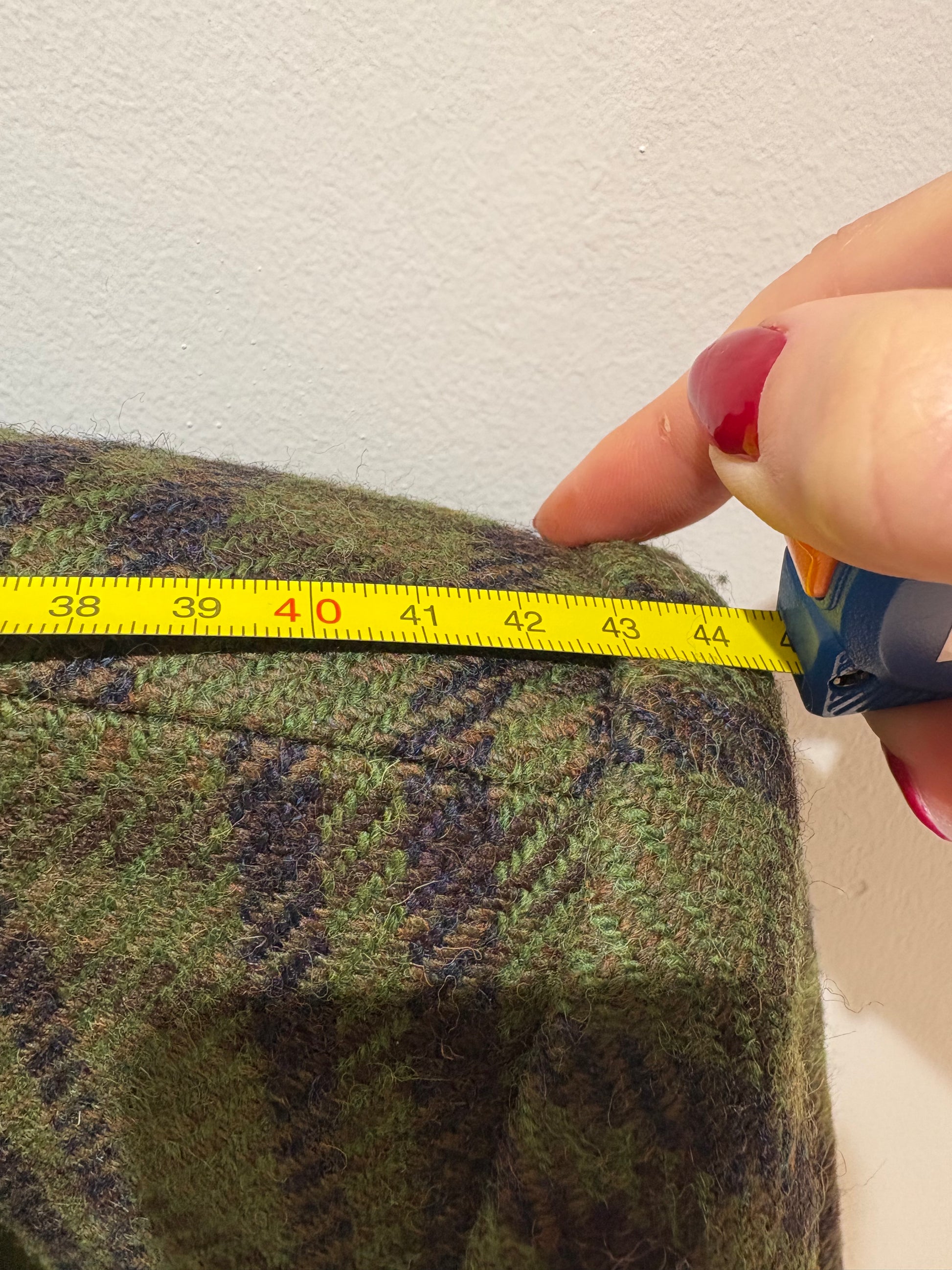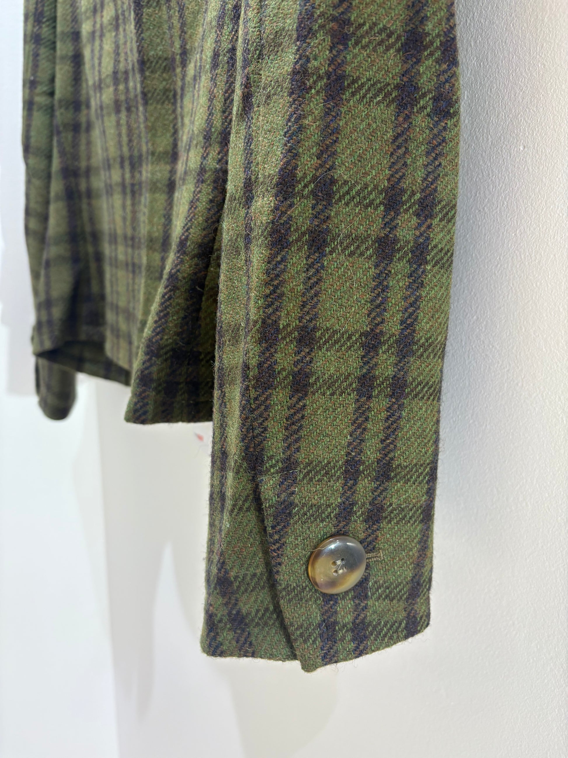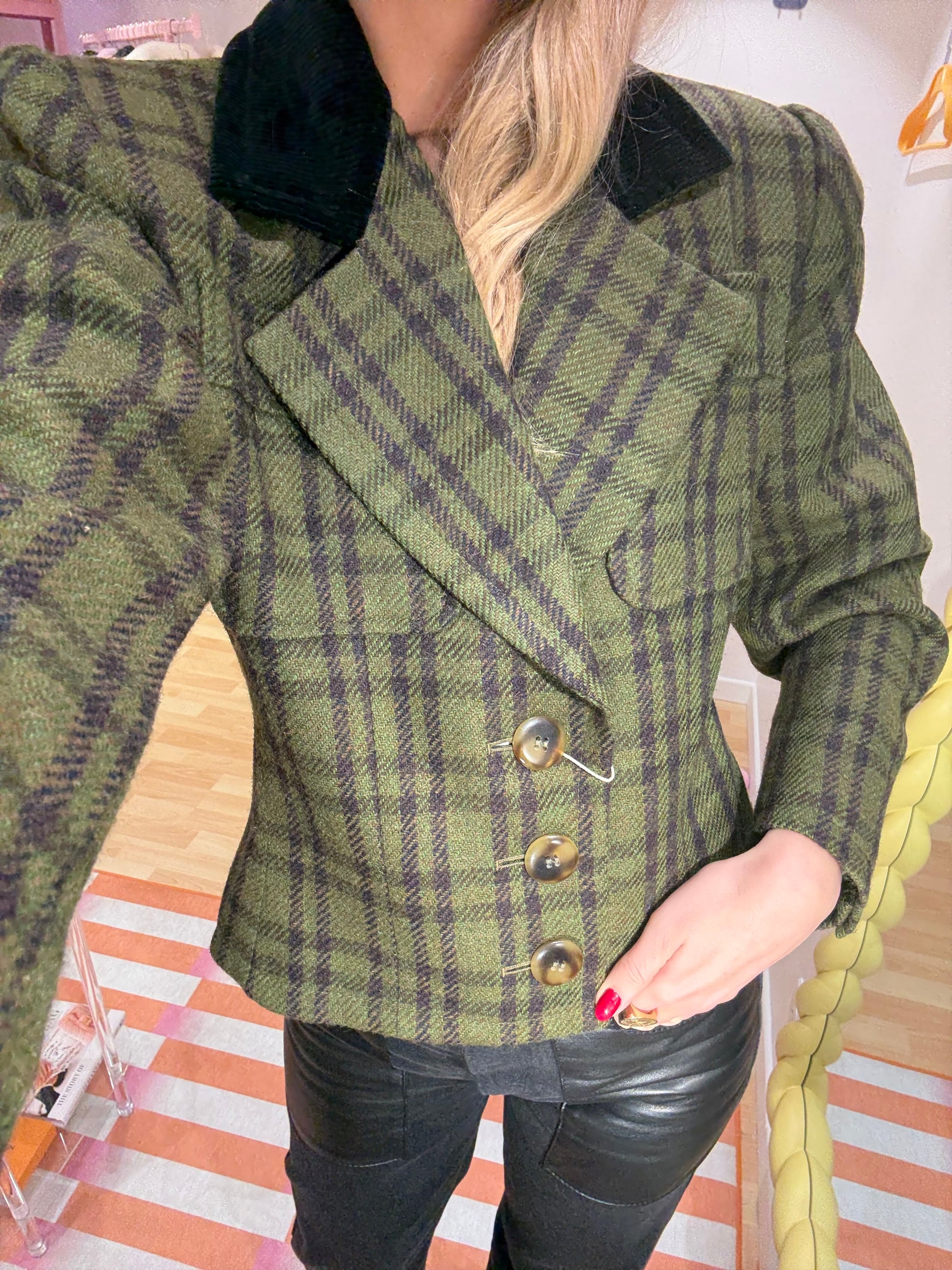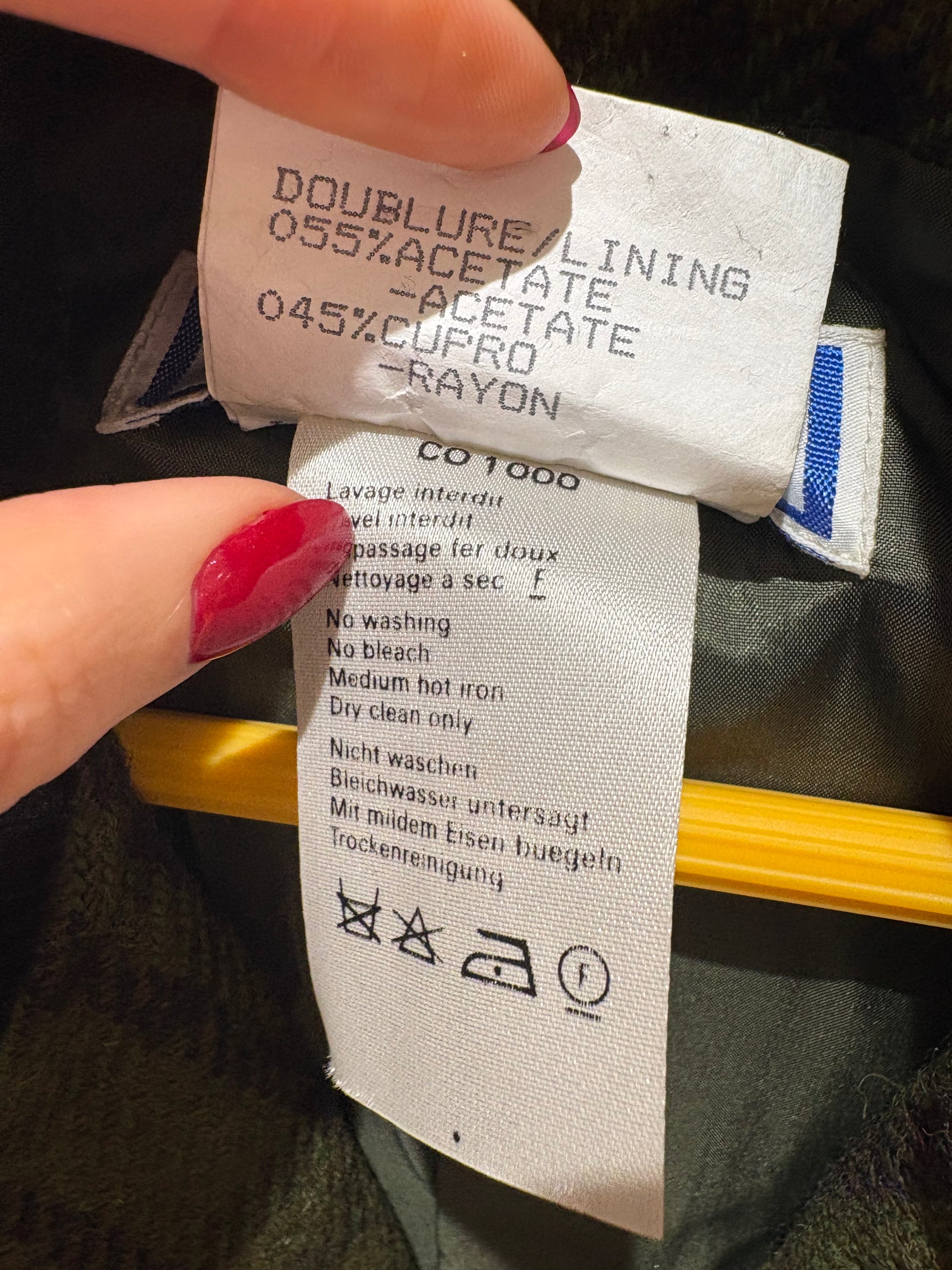 - Matière & motif : lainage épais à carreaux vert kaki et bleu/marine, très typique des collections automne/hiver YSL de cette période.